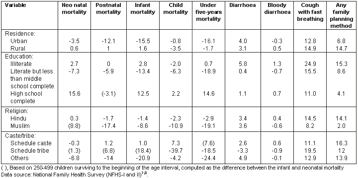 Background variables affecting percentage net change in health outcomes is presented (Table 6). The percentages of neonatal, postnatal, infant, child and under-5 years mortality decreased in urban areas and marginally decreased in rural areas. Among illiterates there was a negligible increase in neonatal and infant mortality. There was an unexpected 16% increase in neonatal mortality and 15% increase in under 5 years mortality among the children of respondents who had completed high school and above.