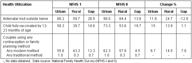 There was an increase in the immunisation rate of children of 12-23 months of age but the urban-rural differential increased from 18.6% in 1992 to 19.7% in 1998 despite net change in both urban and rural areas. The use of contraception increased among couples using 'any modern method', this inter-survey increase in health consciousness was, however, relatively higher in rural areas. Regarding the use of contraception, there was a trend of increase in both rural and urban areas, but the percentages of use were higher in urban areas in both the surveys. The urban-rural differential in couples using any modern method decreased from 12.3% to 4.5% by 1998, whereas there was no change in the urban-rural differential for total couples using any traditional method. This indicated a net change in health utilisation although urban-rural differentials still existed in health utilisation in Andhra Pradesh.