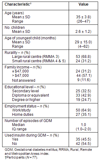 Several recent studies reported the nature and prevalence of postpartum diabetes risk behaviours in women with previous GDM but few studies included rural women. A retrospective study of health behaviour in 121 Danish women with previous GDM showed participants with a weight above the healthy weight range (BMI >25 kg/m2) were more likely to gain than lose weight (33% vs 18%; p<0.05)8. Most expressed some degree of concern about developing diabetes, but there was no significant association between concern and weight loss or activity level either before or after pregnancy.