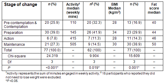 There was a statistically significant difference in self-reported activity level, BMI, and FS over the four behaviour change stages (Table 2). The median value for physical activity and fat score increased steadily from pre-contemplation/contemplation to maintenance stage. Participants in maintenance recorded the highest level of physical activity. There was a statistically significant difference in BMI between women in the preparation stage compared with those in the pre-contemplation and action stages. The highest median BMI was recorded at the preparation stage and the lowest at pre-contemplation and action stages.