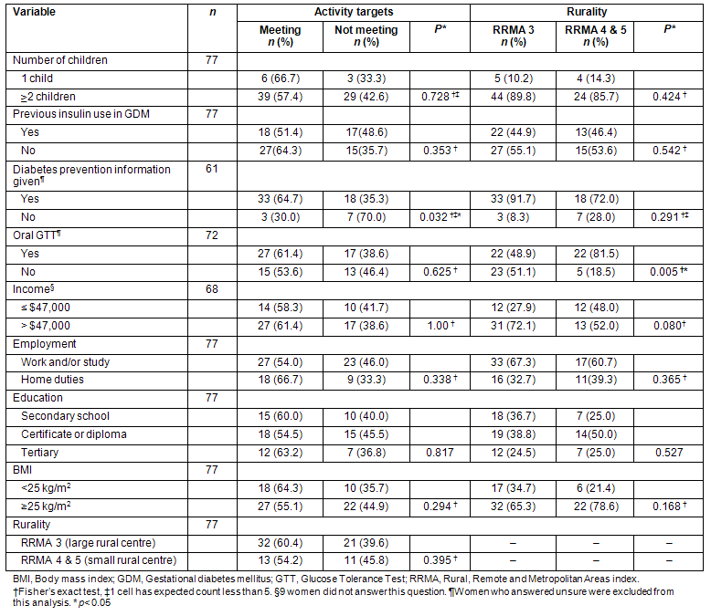 There was no significant association between any of the variables measured and the proportion of women meeting activity guidelines (Table 3) with the exception of women who remembered receiving diabetes prevention information and meeting activity targets (p<0.05). Additionally, there was no significant association between the rurality index (Table 3) and any of the variables measured. However, women living in a large rural area (RRMA 3) were significantly less likely to have a post-partum OGTT than women who lived in small rural areas (RRMA 4 & 5) (p<0.005).