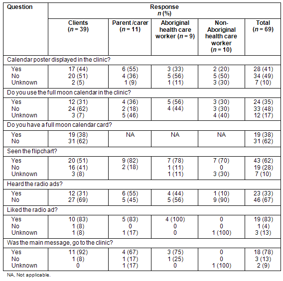 The flipchart was the most recognised health promotional tool used in the Full Moon Strategy. It was not a new tool, having first been introduced by the RHD program in 2002; however, the flipchart was adapted to include the full moon calendar. While the radio advertisement was the least known promotional tool, one-third of interviewees recalled the advertisement. In comparison, in a recent media campaign in Queensland, Australia 17% of participants could recall an advertising message without prompting, 83% could recall a television advertisement with prompting and 20% a poster with prompting10. The present results were consistently higher than those experienced in Queensland and support the use of media campaigns as health promotional tools.