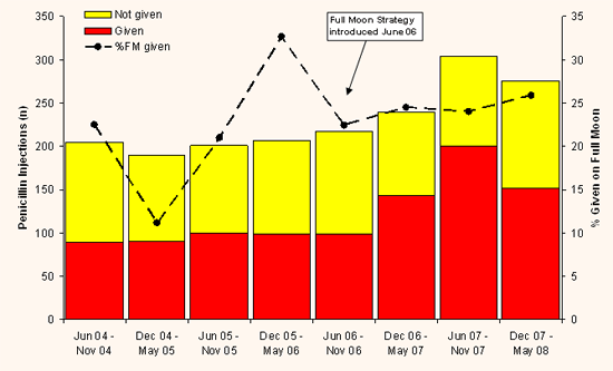 Figure 1: Penicillin prophylaxis due each month and percentage of doses administered during the week of the full moon, June 2004-June 2008.