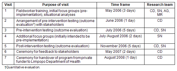 Positive sentiments expressed during visit 6 were echoed even more strongly at the seventh visit, at which the ownership of the program was transferred from corporate funders to the Department of Health. Just prior to this event, 60 Department of Health nurses had received training to implement the program in their clinics as part of the wider dissemination to other communities in the district. Representatives from the delayed-intervention community (where the program was implemented after the completion of the research) were also present, which was encouraging to the researchers.