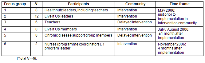 A total of six focus groups (Table 3) were conducted in the communities (total n=45), either at schools or health clinics. Two focus groups (n=8, n=12) with leaders (of the Healthnutz program) and teachers were conducted during their training, just prior to program implementation; all those undergoing training were invited to participate in the focus groups. One focus group was conducted with teachers from the school in the delayed-intervention community (n=6), and this took place at the school. An additional two focus groups were conducted approximately 1 month after implementation: one with Live it Up members (n=8) and the other with chronic disease support group members in the delayed-intervention community (n=8). For both these focus groups, nurses at the clinics involved in the program invited members of the chronic disease support groups to participate in the focus groups. One focus group (n=3) was conducted 4 months after implementation with nurses and a community leader from the intervention community to assess their impressions of the program's progress in their community.
