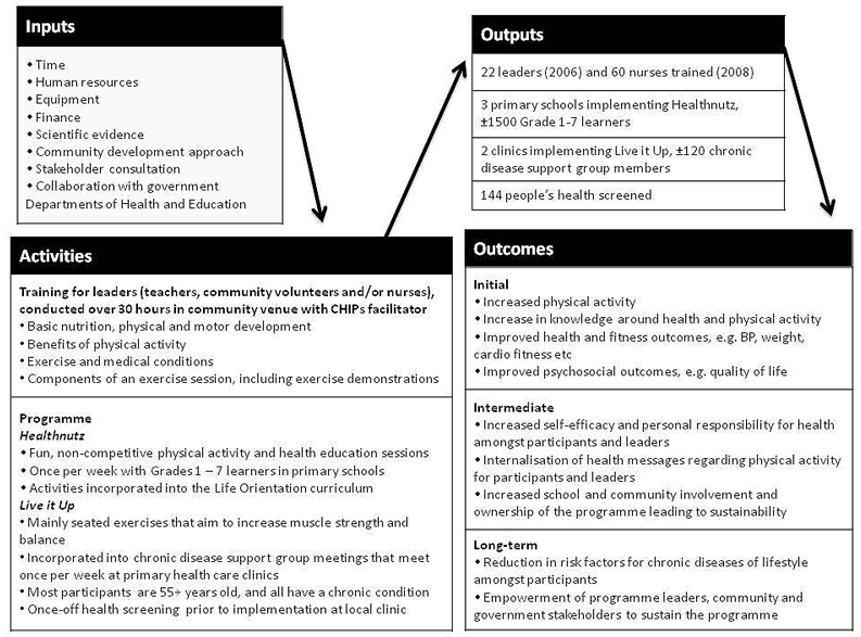 The two CHIPs programs that were implemented as part of the DHLP were 'Healthnutz' for children and 'Live it Up' for older adults (>60 years). Although these two CHIPs programs have generally been implemented separately, and not necessarily in the same communities in the Western Cape, for the purposes of the DHLP, the two programs were implemented together. Details of these programs are outlined in the logic model (Fig1).