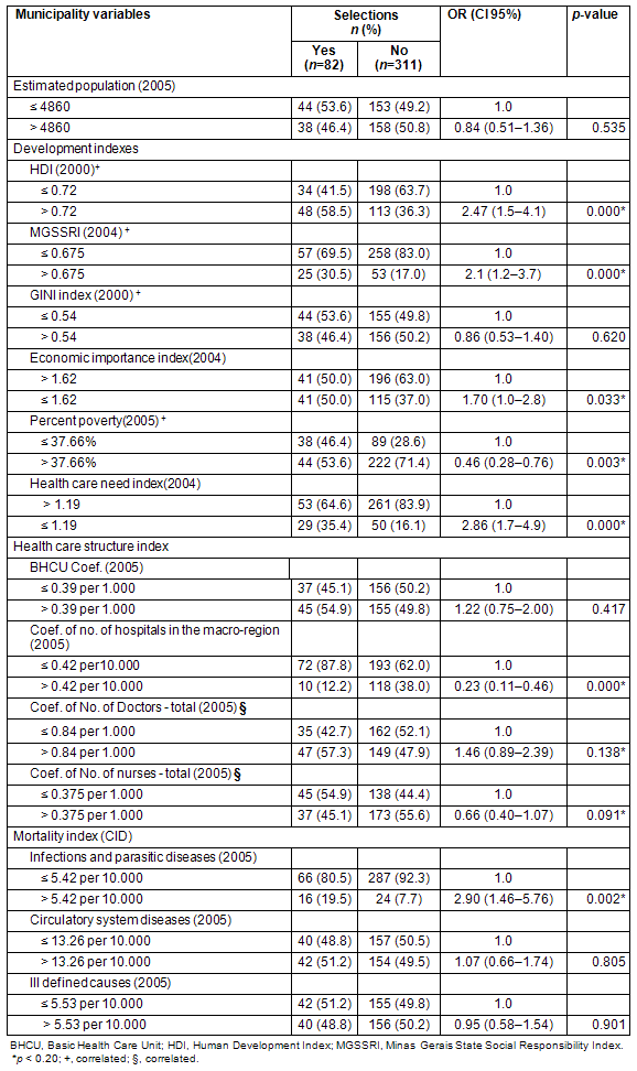 Most development indexes, including the HDI, the MGSSRI, the GINI Index, the Economic Importance Index, the Percent Poverty Index, and the HCNI, revealed a significant difference between the groups (p < 0.04), as well as all health structure indexes, except the basic health care unit index (BHCU). The following coefficients were significantly different between groups: number of hospitals per macro-region and human resources, including the number of doctors and nurses (p < 0.15). Concerning the mortality indexes, only mortality by infections and parasitic diseases was significant in the univariate comparison of the program inclusion (p < 0.01). The intervention group presented higher mortality from infections and parasitic diseases in relation to the comparison group.