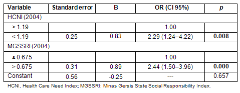 The results of the final model of the estimation equation are given (Table 2). Only the HCNI and the MGSSRI correlated with the implementation of the program (p < 0.01) in the fitted model. The municipalities with the lowest HCNI had a two-fold larger change of participation in the program (OR: 2.29, confidence interval [CI]: 1.24-4.22). Likewise, those with higher MGSSRI had a 2.5 greater chance to be included in the program (OR: 2.44, CI: 1.50-3.96).