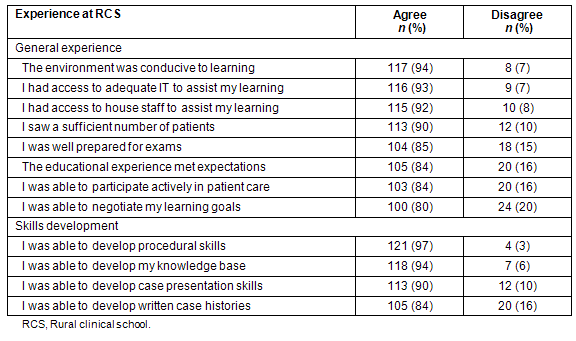 Twelve questions were used to evaluate educational experiences at the RCS. To aid interpretation the original six-point response scale was collapsed into two categories: 'disagree' (disagree strongly, moderately, slightly) and 'agree' (agree strongly, moderately, slightly) (Table 2). All evaluation items recorded greater than 80% agreement (indicating very positive perceptions of the RCS experience). The highest level of agreement for general items was 'the RCS environment was conducive to learning' (n = 117, 94%). For the items concerning skills development, the highest level of agreement related to developing procedural skills (n = 121, 97%).