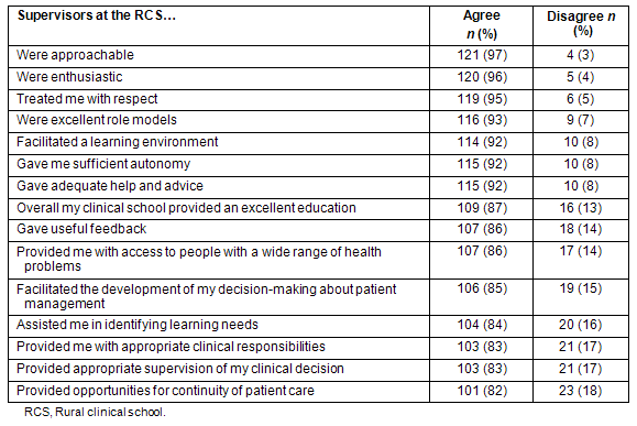 Using a six-point scale, students rated their clinical supervisors on 15 attributes, with responses also collapsed into 'disagree' or 'agree' (Table 3). For all items the agreement rate exceeded 80%. The majority of students found supervisors approachable (n = 121, 97%), enthusiastic (n = 120, 96%) and respectful (n = 119, 95%).