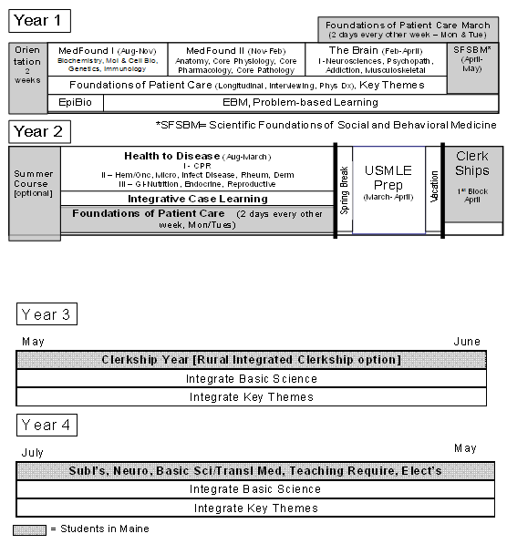 The 4 year medical school program begins with a 2 week orientation period in Maine. This occurs prior to the annual TUSM orientation in Boston. Specific orientation activities include a 3 day rural preceptorship experience far from Portland (Fig1), team-building exercises in an experiential learning environment, and small-group, self-directed learning activities involving actual patients. Towards the end of the first year, and throughout the second year, Maine-Track students will spend 2 days every other week in Maine, working with an office-based community preceptor. Similar experiences, with the same competency goals, are occurring for the Boston-based students in Boston in this course called Foundations of Patient Care (FPC). Maine FPC preceptors will be predominantly primary care physicians in greater Portland or within a 2 hour radius of Portland. At the end of the first year, a month-long course, called Scientific Foundations for Social and Behavioral Medicine (SFSBM), occurs at both campuses. MMC faculty will teach the SFSBM course in Maine. The third year and most of the fourth year of medical school will be based entirely in Maine (Fig2).