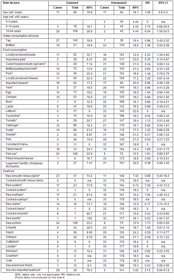 The comsumption of raw seafood imported to the island was found to be statistically significantly associated with the development of symptoms among primary cases. People who consumed raw smooth Venus clams, oysters, scallops, clams and sea squirts were more likely to develop symptoms of gastroenteritis in the following 3 days than those who did not consume these raw products. Far fewer people reported having eaten these products cooked. The consumption of local seafood items, such as sea urchins, limpets, squid, octopus, crab and sea anemone was not found to be a risk factor for acquiring symptoms of gastroenteritis (Table 1).
