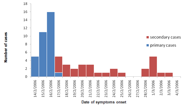 Figure 1: Distribution of primary (n=33) and secondary (n=29) cases of gastroenteritis by symptoms onset in Agios Efstratios, Greece, February-March 2010 (n=62).
