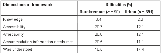 Women in remote/rural areas reported a greater degree of difficulty in accessing doctors at their last visit (c2 = 4.4, df = 1; p = 0.04) and getting their information needs accommodated (c2 = 5.3, df=1; p = 0.02) than women living in urban areas did. There were no differences between women living in rural/remote and urban areas in knowing where to go (c2 = 0.3, df = 1; p = 0.58), ability to afford treatment (c2 = 3.7, df = 1; p =0.06) and in being understood (c2 = 0.05, df = 1; p = 0.82).