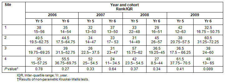 Table 3: Median test rankings and inter-quartile ranges for students by test scores in Years 5 and 6 at the four clinical school sites