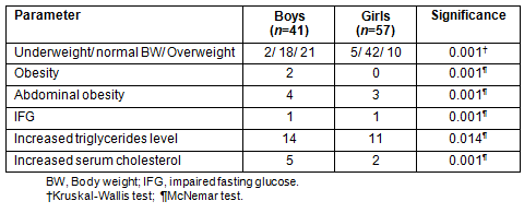 The distribution of metabolic parameters in the study's sample is provided (Table 1). The prevalence of underweight in the total sample was 7.1%; however OW was demonstrated in 31.6% of the adolescents. Between the sexes, 4.9% of the boys and 8.8% of the girls were classified as underweight. Being a girl increased the odds for underweight (OR:1.250, CI:0.8-2.1). Approximately half the boys (51.2%) and 21.3% of the girls were OW/OB. Abdominal obesity was identified in 7.1% of the total sample (9.8% of the boys and 5.3% of the girls). Adolescent boys had increased odds for developing central obesity by 1.405 (CI:0.7-2.8), impaired fasting glucose (IFG; OR:1.200, CI:0.3-4.9), elevated triglycerides (OR:1.514, CI:1.0-2.4) and serum cholesterol concentration (OR:1.806, CI:1.1-3.1). Abdominal obesity increased the chances for IFG 8-fold (OR:8.000, CI:1.6-39.1), as well as for high triglycerides (OR:2.190, CI:0.5-9.1) and serum cholesterol levels (OR:2.167, OR:0.3-15.6).