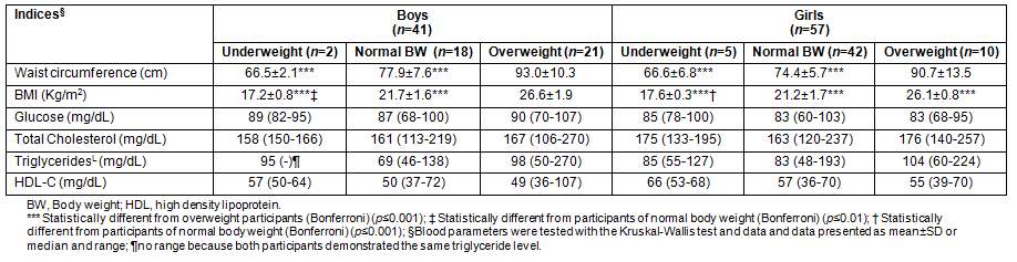 Anthropometric and biochemical indices of the sample are presented (Table 2). Higher waist circumference and BMI were recorded in the OW participants of both sexes compared with those who were not OW (p≤0.001). No differences were observed in the median recorded metabolic analyses among the weight categories.