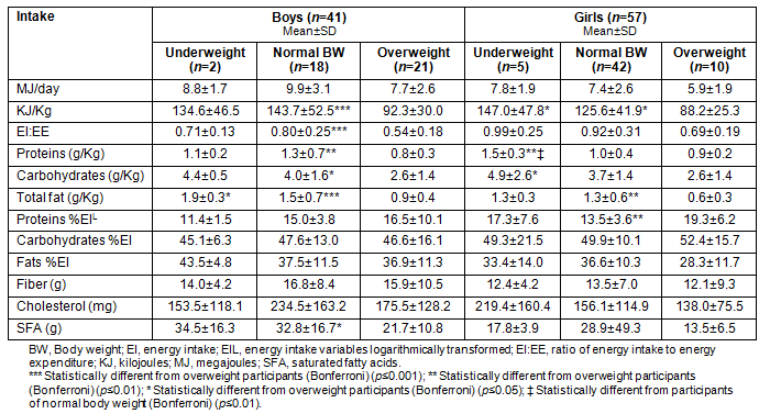 In girls, the trends in nutrient intake were different. Underweight and normal BW girls reported consuming more energy compared with those who were OW/OB (p ≤0.05). Protein intake (g/kg of BW) was more adequate in the underweight group compared with the other weight categories (p ≤0.01 for both) and carbohydrate intake (g/kg of BW) was higher than was recorded by the OW/OB group (p ≤0.05). Phenotypically healthy girls consumed more fat (g/kg of BW) and protein (%EI) compared with those who were OW/OB (p ≤0.01).