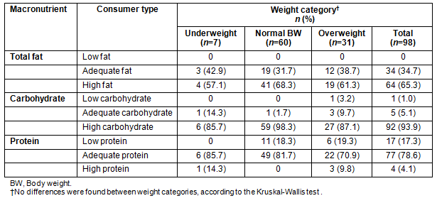 Table 4: Adequacy in the consumption of macronutrients per weight category in the total sample