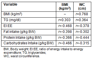 Cross-correlates of BMI and waist circumference for the total sample are presented (Table 5). The BMI and waist perimeter were highly correlated (r = 0.768, p ≤0.001), and they also demonstrated similar patterns of correlation to the triglycerides concentration, and inverse relationships with the ratio EI:EE and the reported macronutrient intake.