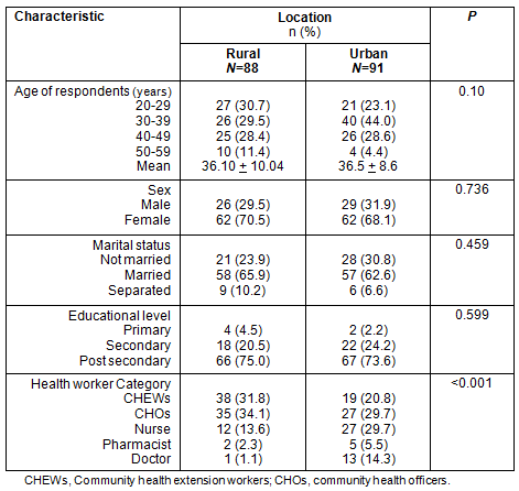 The mean ages of rural and urban LGA respondents were 36.1 ± 10.04 and 36.8 ± 6.86 years, respectively. More than two-thirds of the health workers were female. Approximately 6 of 10 were married with approximately three-quarters having post-secondary education. More than half the respondents were either CHOs or CHEWs (Table 1).