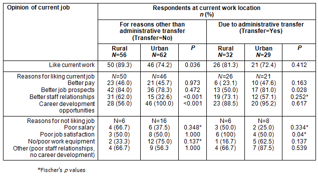 To account for differences in rural attraction and retention due to compulsory (administrative) or voluntary transfer, respondents were stratified into two groups for analysis. In the non-transfer (voluntary) group, a statistically significant rural-urban worker difference (p=0.036) existed with more rural participants liking their current work. However there was no significant difference (p=0.412) within the (administrative) transfer group. In the non-transfer group, for those who liked their current job, the reasons 'better staff relationships' (p=0.00053) and 'career development opportunities' (p=0.00045) were significantly different between rural and urban workers. For the transfer group, the only urban-rural worker difference was that the present job provided opportunities for better job prospects (Table 2). Among those who disliked their current job, the reasons given were not significantly different between the rural and urban groups, irrespective of transfer status (Table 2).