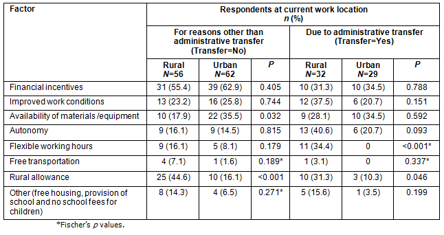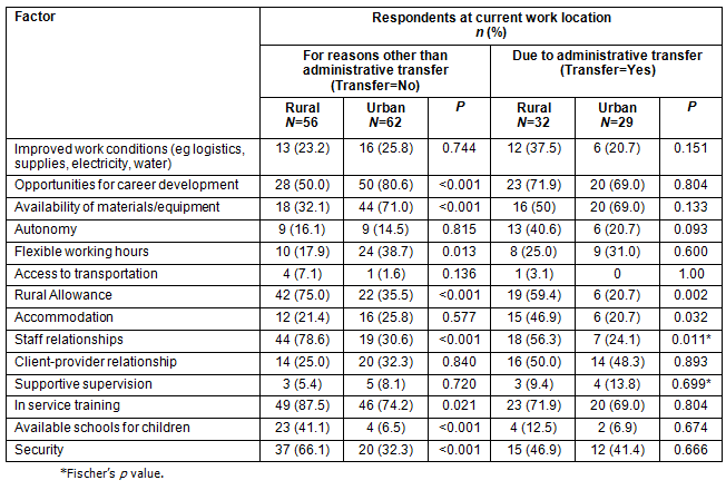 Regarding respondents' reasons for assuming their current employment, while availability of materials and equipment (p=0.032) and rural allowance (p=0.0007) were significantly different for rural and urban workers within the non-transfer group, the reasons did not differ significantly within the transfer group (Table 3).