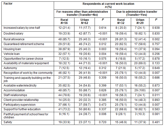 More urban than rural health workers said that opportunities for career development, availability of materials/equipment and flexible work hours could attract them to work in rural areas, while more rural than urban health workers within the same group considered rural allowance, improved staff relationships, payment of children's school fees and adequate security could increase their willingness to work in rural settings. Significantly different factors within the transfer groups were rural allowance (p=0.002), accommodation (p=0.032) and staff relationships (p=0.011) (Table 4).
