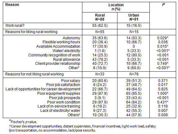 While 62.5% of rural workers expressed desire to continue to work in rural areas, only 16.5% of urban workers were willing to work in rural areas. Among those willing to work in rural areas, major reasons included: autonomy, available accommodation, rural allowance, flexible working hours, community recognition of work, and better client-provider relationships. For those unwilling to work in rural areas, major reasons cited included: poor equipment/supplies, lack of opportunities for career development, poor work condition, lack of electricity/water and poor salary (Table 6).