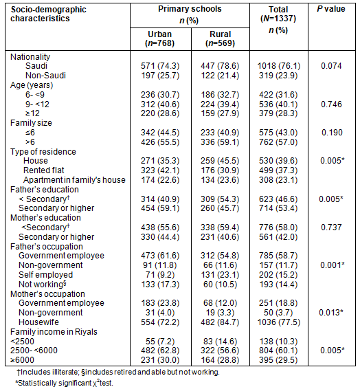 Table 1: Socio-demographics of the included male primary school children, Al Hassa, in relation to urban or rural type of school