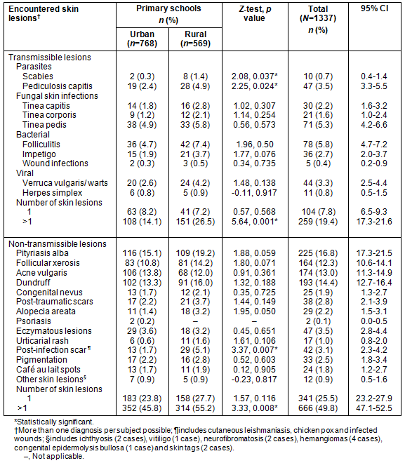 The prevalence of diagnosed transmissible and non-transmissible skin lesions encountered among the school children according to location is provided (Table 2). The overall prevalence of transmissible skin lesions was 27.2% (CI=24.8-29.6); in rural children it was 33.7% (CI= 29.9-37.6), compared with 22.3% (CI=19.5-25.3) in urban.