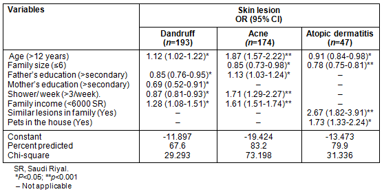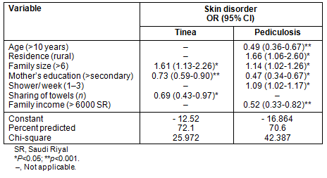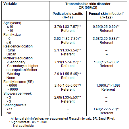 Table 4: Logistic regression models for common transmissible skin disorders among the included male primary school children, Al Hassa
