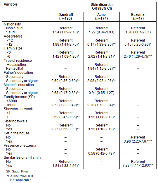 Table 3: Univariate analysis of commonly encountered transmissible skin disorders in relation to socio-demographic and hygienic habits of male primary school children, Al Hassa