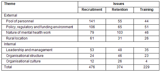 The issues external to organisations are those of personnel, environment, nature of mental health work and rural location, and issues internal to the organisations those of management and organisational structure and culture. The weightings suggest that recruitment is regarded by managers as a matter of greater urgency than retention or training and that the organisations themselves are of a second order of significance in terms of perceived workforce difficulties. However, to the extent that the organisations are acknowledged, management is critical.