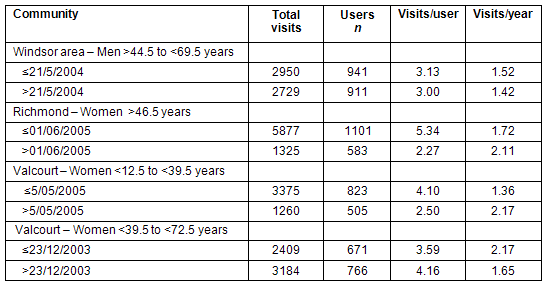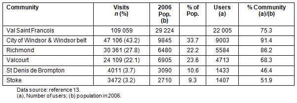 Table 1 shows that the 6 facilities considered in the present study satisfy a high proportion of the primary care demand. The highest participation is in the Windsor area, where 91.4% of its population visited at least one of the six facilities in the present study once. A low percentage of users came from the communities of St Denis de Brompton and Stoke, indicating that these communities were probably seeking healthcare services outside the Val Saint Francois, because there is no medical service in either community. For the purposes of this study, a 'visit' is a formal request to see a doctor. Tourists, visitors, and individuals without a valid healthcare card are accepted at all medical services but these visits were excluded from this study.