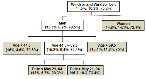 A graphical representation of the tree for the city of Windsor and Windsor belt is presented (Fig2). Note that the visits from these communities were split first by sex, men's visits were then divided by age groups, and one age group subdivided according to date of visit. This tree indicates the existence of four users' profiles for men and only one for women. The homogeneity of women's visits by age or date did not lead to further mining. Patterned boxes in Figure 2 show the five homogeneous groups, the three percentages in parenthesis indicating each group's preferences for hospital ERs, CSLCs, and the Minor Emergency. A change in user behaviour occurred by 21 May 2004, when the probability of choosing the Minor Emergency went from 80.3% to 73.4%. The 7% decrease was split between the hospital ERs and the CLSCs, increasing their probabilities by 3.3% and 3.6%, respectively. Classification trees do not provide the reason for such change but they point out a search direction for further analysis.