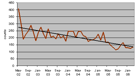 Before July 2002, 30% of males aged between 1.5 and 46.5 years changed preferences. This date was just 3 months after the start of the present data collection; no special event occurred at that time and so this change may not be significant to previous level of service. On 1 June 2005, women aged 46.5 years and older shifted from the local CLSC to the further Minor Emergency. Around this date, the CLSC lost two doctors, reducing the capacity of this facility for a few weeks. The recursive tree found that older women changed their choices but this reduction in service did not affect men older than 46.5 years who preferred the ERs. Figure 3 shows a declining number of visits per month in the CLSC Richmond. The service reduction in the summer of 2005 is clearly visible in the graph (Fig3), but identifying the shift of preferences and its magnitude is one of the benefits of the classification tree.