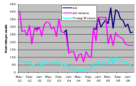 In the previous section four major preference changes within the same age-sex group was found. Further analysis of these groups revealed that average use also changed for all of them. The number of total visits, number of users, average number of visits per user and the equivalent average number of visits per year is provided (Table 6). It was necessary to add this last value because the dates split the present 4 year period of study into uneven time intervals; because the number of patients in each interval is different, the changes were underlined in an equivalent per year basis.