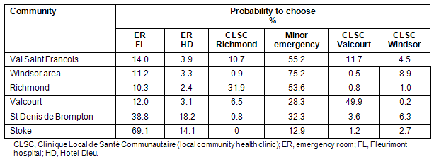 The most important explanatory factor in patients' choice of primary care facility was the community. The first split of the recursive tree method is presented (Table 2): the distribution of visits among the 6 healthcare facilities for each community, with the city of Windsor and Windsor belt aggregated by the classification tree because the distribution of visits was homogeneous enough to further split. Overall, the most preferred facility of VSF was Minor Emergency with 55.2%, followed by the ER of FL with 14% and the local CLSC clinics. The populations of Richmond and Valcourt used their local CLSC clinics more than the other communities and the preference for the FL in St Denis de Brompton and to Stoke may be explained by the fact that it is the closest facility. Distance is therefore the first important factor of choice.