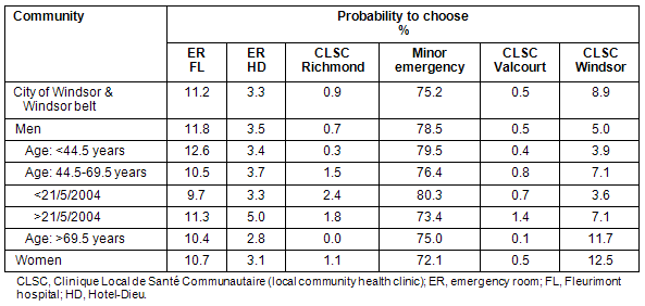 In the Windsor area sex and age were the second and third factors of importance in facility choice. A larger proportion of men used the Minor Emergency, and older men and women used the local CLSC (Table 3). All 6 probabilities of choosing the facilities are presented (Table 3: data expanded from Fig 1). The Minor Emergency was found to be closed during weekends from the beginning of May 2004 until mid-July 2005. Men in the age group 44.5-69.5 years changed their preferences after this reduction in service but the percentages of women of all ages did not change. It is interesting to note that although weekend services resumed in July 2005, men aged 44.5-69.5 years did not resume their previous behaviour.