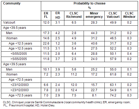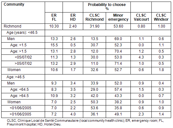 The recursive tree results for the community of Valcourt are shown (Table 5). Age again is the second criterion, and sex third. Young men (<39.5 years) preferred the Minor Emergency more than older men who preferred the local CLSC.