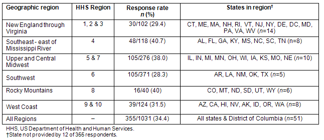 For description and analysis purposes, responding hospitals were assigned to major geographic areas based on US Department of Health and Human Services regions; SPSS v15 (SPSS Inc; Chicago, IL, USA; www.spps.com) was used for all analyses. Details on the geographic groupings are given, with response rates by region (Table 1). The overall response rate was 34.4% (355/1031).