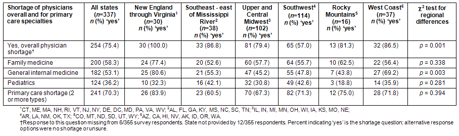 Cross-tabulation was used to compare geographic regions related to shortages of physicians and other healthcare professionals. Primary care specialties were defined as family medicine (FM), general internal medicine (IM) and pediatrics (PEDS). Chi-square statistics were used to assess differences in the patterns of responses between regions. Analysis of variance was used to compare means on Likert-scale questions assessing recruitment and retention. Assessment of the magnitude and direction of the association of the correlation between extent of PC physician shortages in the community and the rating on each of the recruitment/retention factors (ranging from 1 to 5), was conducted using Spearman's Rho. In addition to looking at need for specific PC specialties, as a measure of the extent of the need for PC physicians a composite variable (ranging from 0 to 3) and based on the number of different types of PC physicians was operationalized. This PC shortage variable ranged from none of any type of PC physicians needed to all three PC specialties needed specifically valued as: 0 if no PC specialties were needed; 1 if one type of PC specialty was needed; 2 if two types of PC specialties were needed; and 3 if three types of PC specialties were needed.