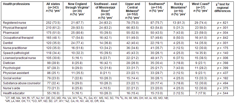 With respect to shortages of other healthcare professionals, the four most frequently reported nationally were registered nurses, physical therapists, pharmacists and occupational therapists. Again, the percentages reported for these professions were highest in the New England through Virginia region. Whether this is unique to the respondents reporting in this study or is a pattern in the region would require a more detailed regional study. Overall, results are consistent with recent calls for training and placement of such health professionals as nurses and pharmacists to meet rural and underserved population needs.