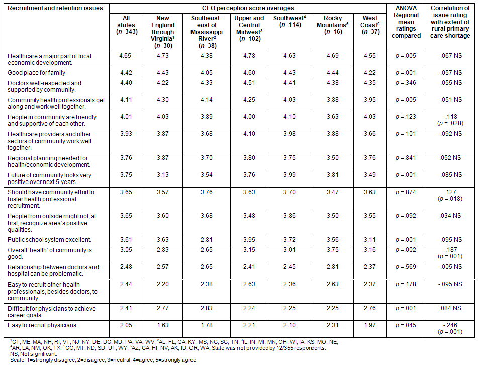 The rural CEOs' views of issues in recruitment and retention of health professionals in their communities is summarized (Table 5). Overall, in relation to the health and status of the community, the CEOs most strongly agreed that health care is a major part of local economic development. Regionally, all CEOs tended to agree with this statement, although hospital administrators in the New England through Virginia and the Upper and Central Midwest regions more often agreed with this assessment, particularly in comparison with CEOs located southeast of the Mississippi River. Nationally, the CEOs also agreed that their communities were good places for a family and that doctors were well respected and supported in their communities. Although not rated quite as highly, the rural CEOs also generally positively evaluated their communities in agreeing that: community health professionals get along and work well together; people in their communities are friendly and supportive of each other; and healthcare providers and other sectors of the community work well together. However, the CEOs were neutral or below in their response to the statement that the overall health of the community is good. Most skeptical in this appraisal were CEOs in the regions southeast of the Mississippi River and New England through Virginia.