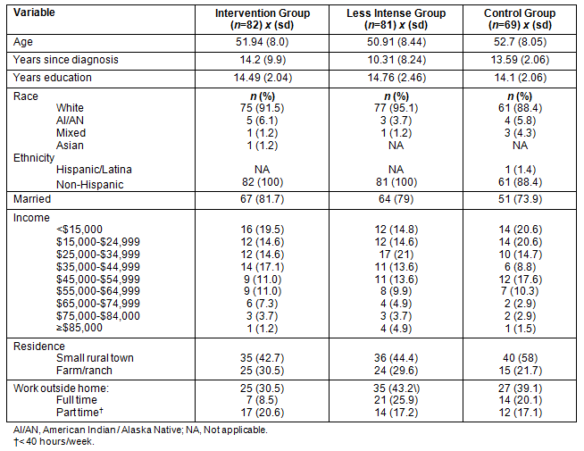 Eighty-two women participated in the supportive computer intervention. Their ages ranged from 36 to 65 years with a mean of 51.94 (sd=7.55). Of these women, 75 (91.5%) were Caucasian, 5 were American Indian, one was Asian, and one was of mixed race. The majority of women was married (81.7 %), most (42.7%) lived in a small rural town, while almost one-third (30.5%) lived on a farm or ranch. All of the women had at least a high school education (x=14 years; sd=2; range 12-19.5 years). The greatest number of women reported income of less than US$15,000 (n=16; 19.5%) with the next greatest number indicating incomes in the $35,000-$44,999 range (n=14; 17.1%). Twenty-five (30.5%) were working outside of the home on a full time (n=7; 8.5%) or part-time basis (n=17; 20.6%). The length of time since diagnosis with chronic illness ranged from 2 to 40 years (x=14.2; sd=9.99). No significant differences in demographics were found between the women in the computer intervention group and the women in the less intense computer and control groups with the exception of years since diagnosis. Women in the less intense group had a mean of 10.2 years since diagnosis compared with 14.2 and 13.6 years for the intervention and control groups respectively. The demographic information for all three groups of women is displayed (Table 1).