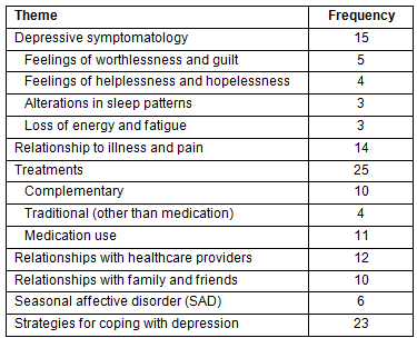 The two most frequently discussed topics related to the experience of depression were the relationship of symptoms of depression to chronic illness and pain (n=14) and the healthcare treatments used (14), both complementary (10) and traditional (4). The women's relationships with healthcare providers (12) were often described as was their use of medications (11). The disruption in relationships with family and friends was also mentioned (10). Seasonal Affective Disorder was specified as a cause of depressive symptoms (6).
