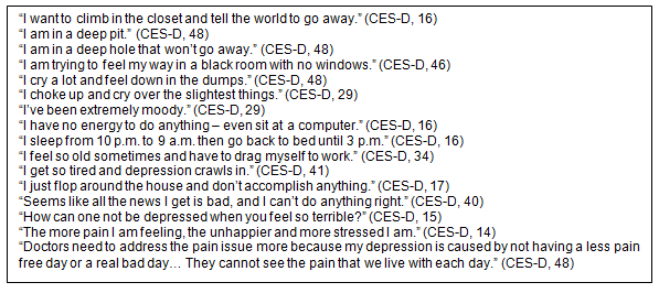Relationship of depression with illness and pain: The belief that symptoms of depression frequently accompany their chronic illness and pain were common topics of their exchanges. One woman wrote: