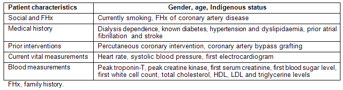 The recently finalized Australian Acute Coronary Syndrome Prospective Audit (ACACIA)7,17 registry gathered data of 3402 ACS Australian patients. Chew et al. found that major preventable risk factors for cardiovascular disease1 and in-hospital measurements were independent predictors of hospital mortality of acute coronary events18. A simplified version of this method17,19 was used to gather retrospective data at the Geraldton Regional Hospital and the Kalgoorlie Hospital.