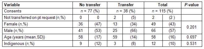 Table 3: Demographic patient characteristics and p-values, by transfer status